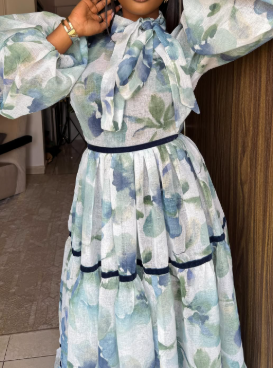 Lantern Sleeve Lace-Up Printed Dress
