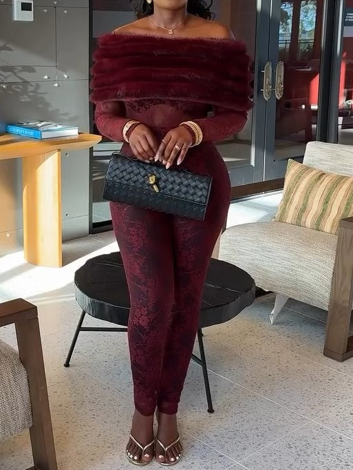 Tweed Fluffy Panel Off Shoulder Jacket Set