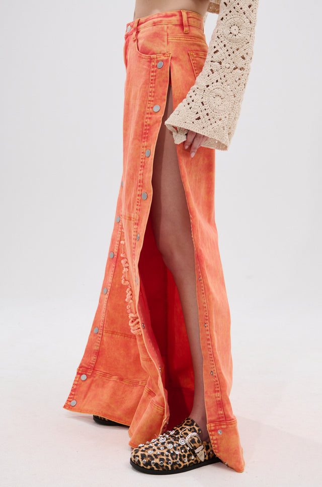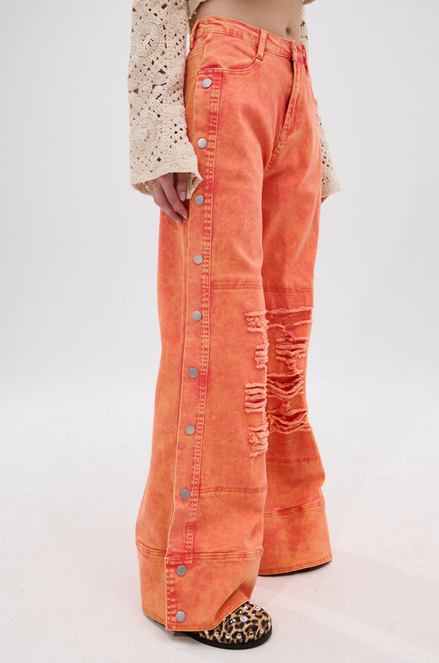 Elevate your wardrobe with some zesty denim. The Above Average Distressed Side Snap Jeans is a bold statement piece crafted from a bright orange, washed denim and features a high-rise fit, functional belt loops, a four-pocket design, ultra-ripped distressed detailing on the lower pant legs, full-length silver-tone snap buttons running down each side, and a front zip fly. Complete with a relaxed wide-leg silhouette. Pair with anything from a loose blouse to a cropped baby tee for an effortlessly cool finish.