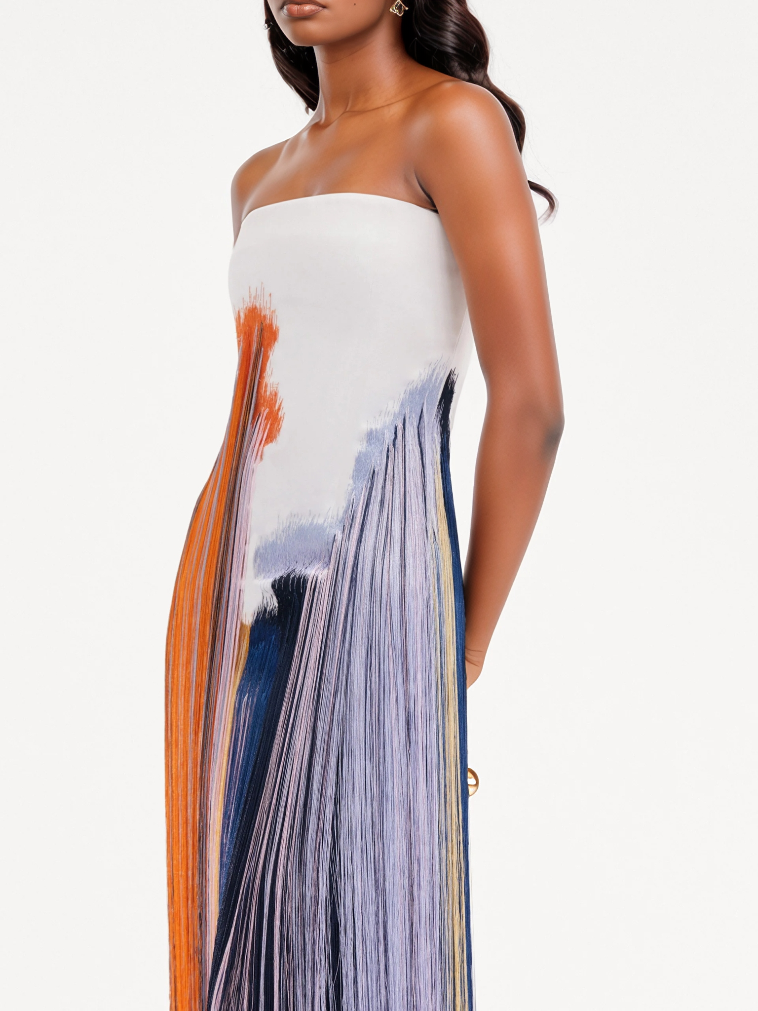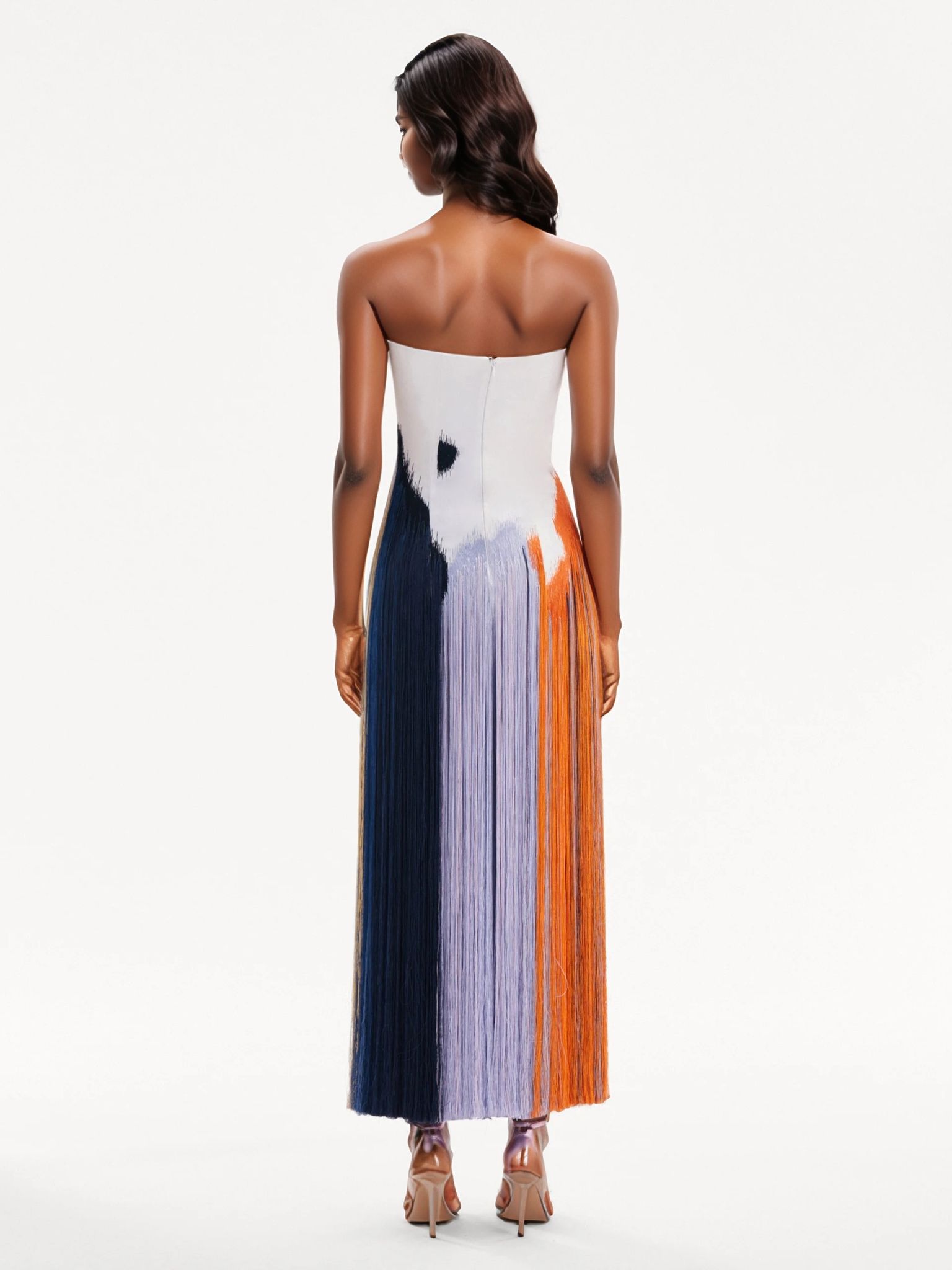 Applied individually by hand, color-bright silk fringe embroidery emulates the technique of this season's hero abstract brushstroke print. With a strapless neckline and fitted bodice, this cocktail dress is a paradigm for the House's mastery of elevated event wear.