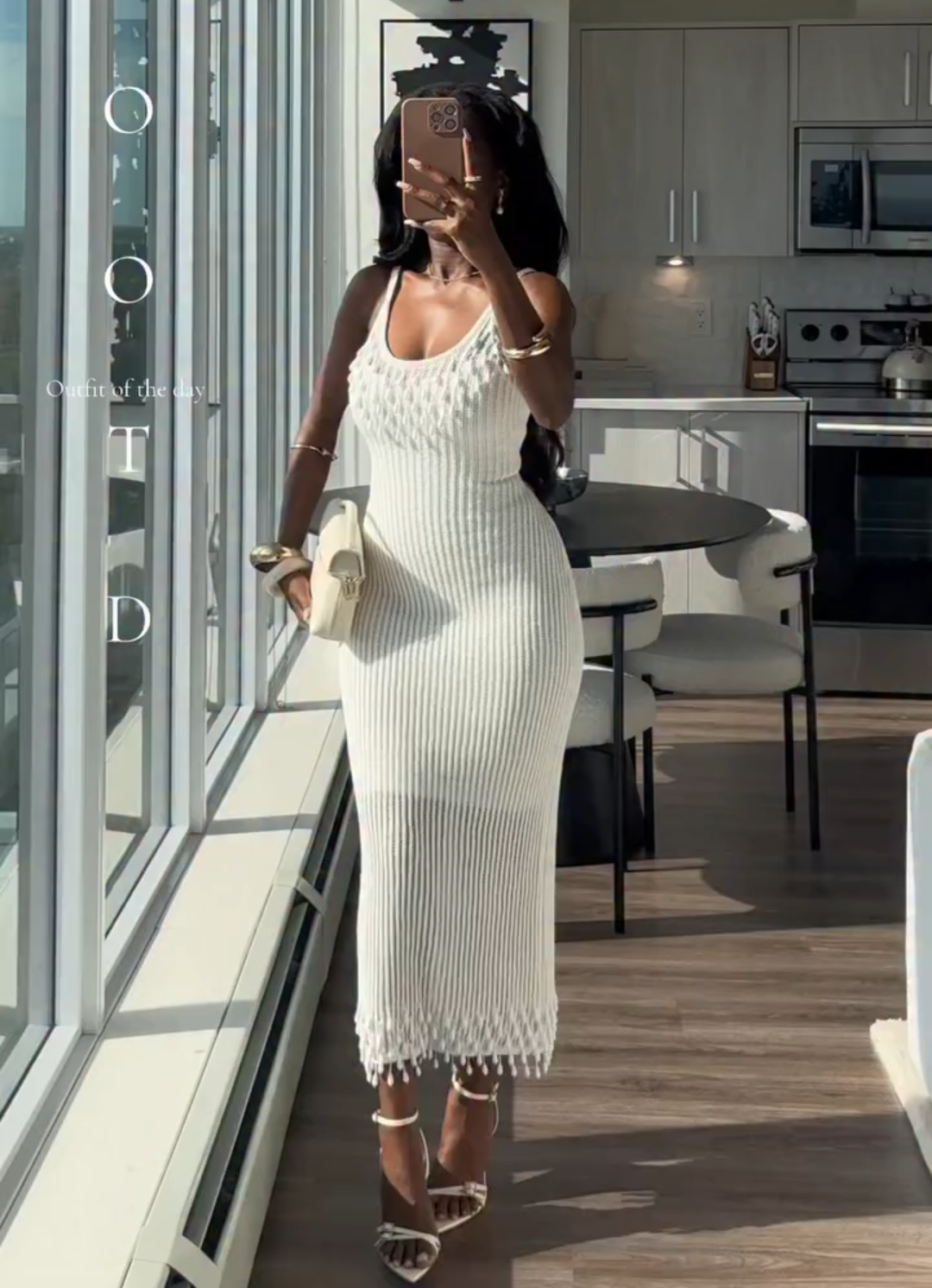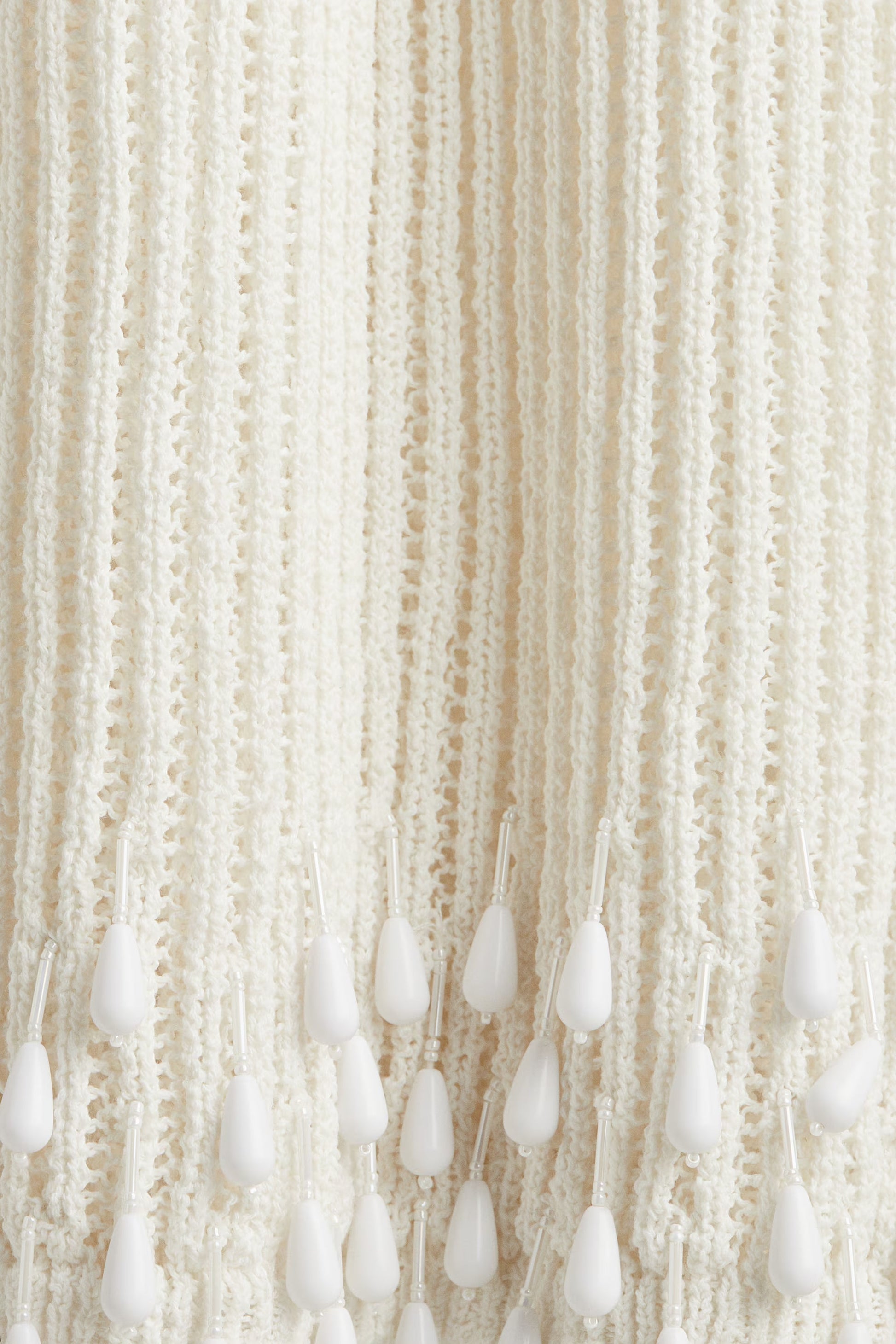 Fitted, ankle-length dress in a loose knit embellished with tone-on-tone beads at neckline and hem. Narrow shoulder straps, scoop neck at front, and a round, low-cut back.Length:Long