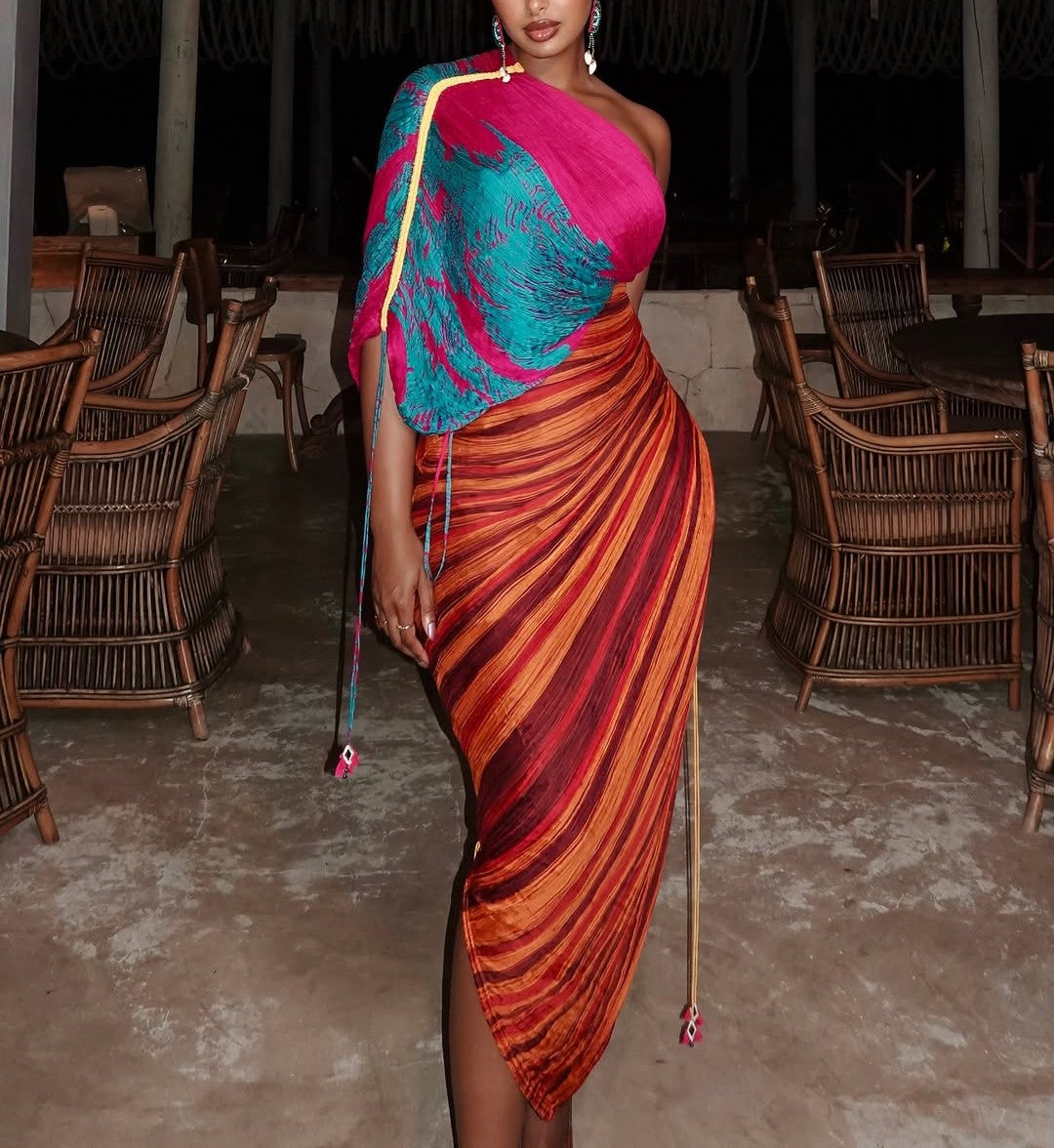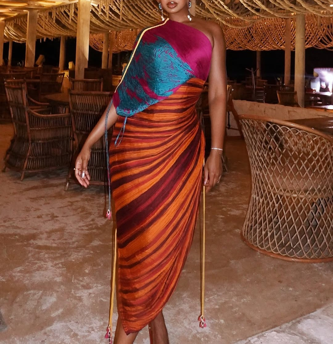 The Dress is an absolutely striking piece. The combination of saturated pigments such as rust, maroon and turquoise create a vibrant yet refined touch to the attire. The hand micro pleating and asymmetrical silhouette adds texture and richness to the dress, making it visually appealing. The adjustable length feature is a great addition as it allows you to customize the dress according to your preference and occasion, ensuring versatility. The fusion of the traditional sari elements with contemporary design creates a unique and chic look.