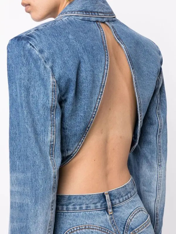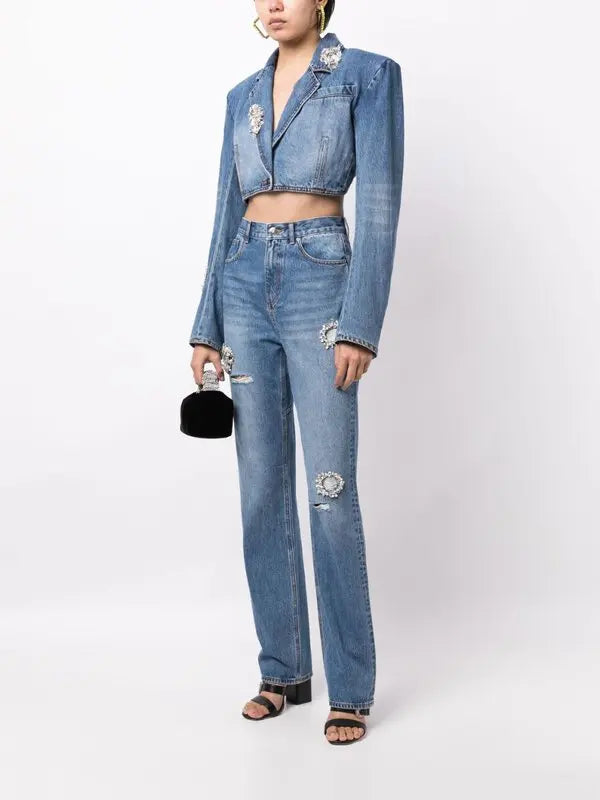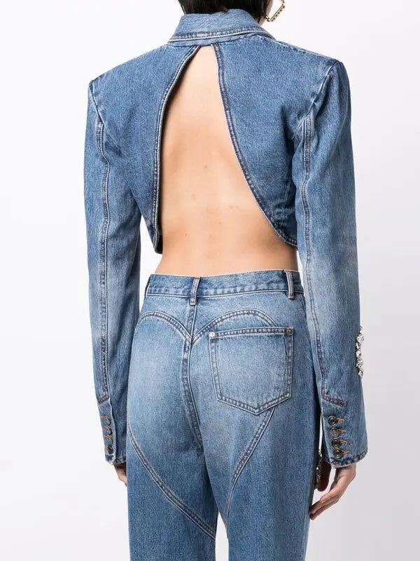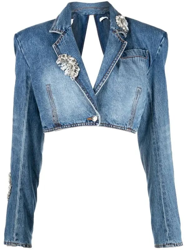 Indigo blue Crafted from cotton denim Notched collar Crystal embellishment Chest welt pocket Front button fastening Long sleeves Buttoned cuffs Open back Cropped Straight hem Slim fit