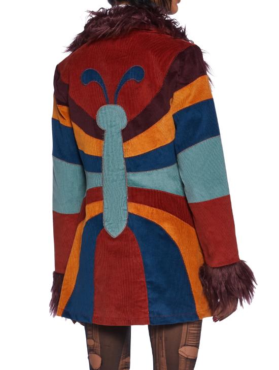 spread those wings. This coat comes in a corduroy construction, with faux fur trim, a striped pattern with a butterfly detail at back, and engraved button up closures.