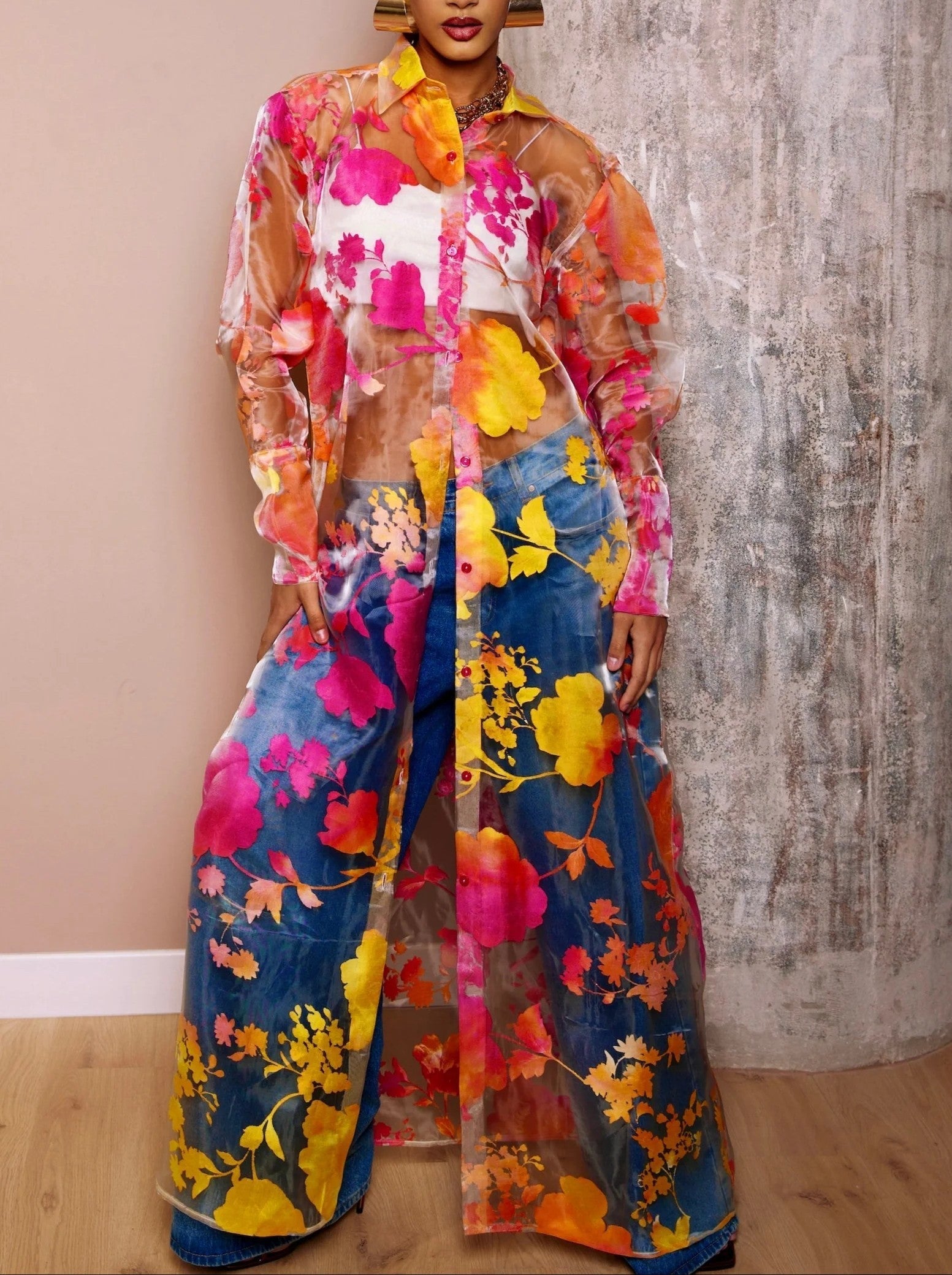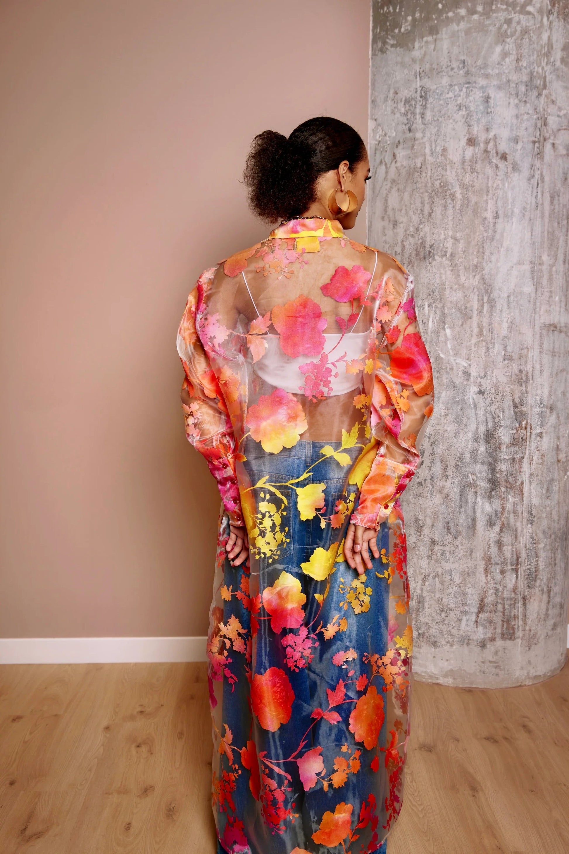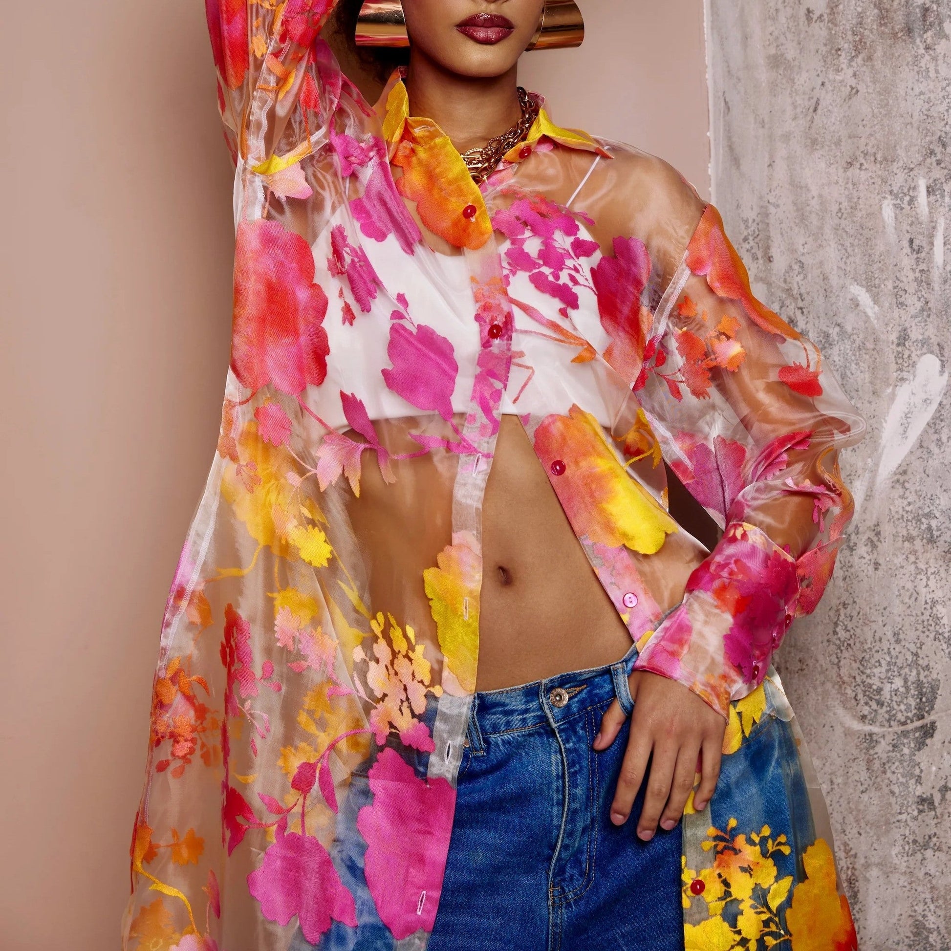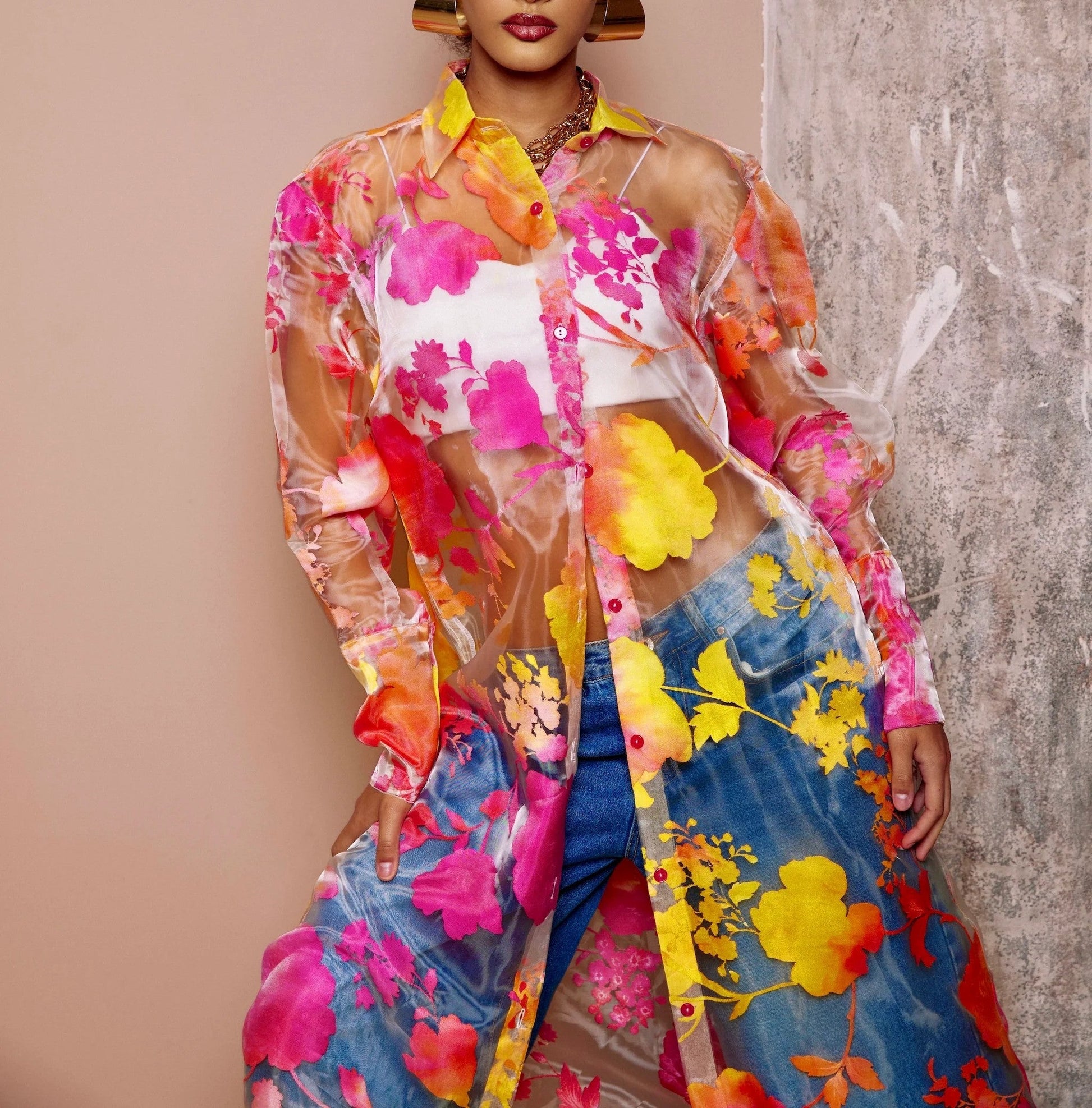 The Blossom Shirt Dress is a stunning fusion of sheer elegance and vibrant florals. Featuring a breezy, translucent shirt dress adorned with bold, colorful blooms, this statement piece is perfect for that special occasion. The lightweight fabric drapes effortlessly, while the longline design and relaxed fit add a touch of effortless sophistication. Wear it open for a flowy, ethereal effect or buttoned up for a chic, structured look. Whether paired with denim or worn as a standalone dress, it’s the ultimate expression of modern femininity.