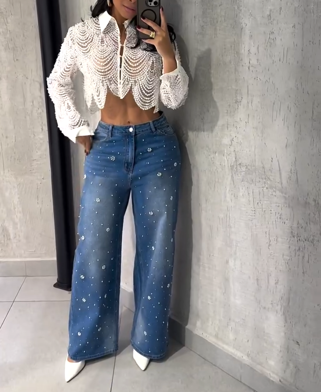 The "Arabella" blouse is a true masterpiece of elegance and sophistication. It impresses with its delicate pearl trim on the buttons and detailed pearl appliqués, which are not just sewn but firmly riveted to guarantee its durability and quality. This luxurious pearl trim adds an exclusive touch. The special cut of this blouse is distinguished by the wavy hems at the bottom, which lend it a playful, feminine charm. This flowing cut creates a graceful silhouette and emphasizes the wearer's delicate elegance.