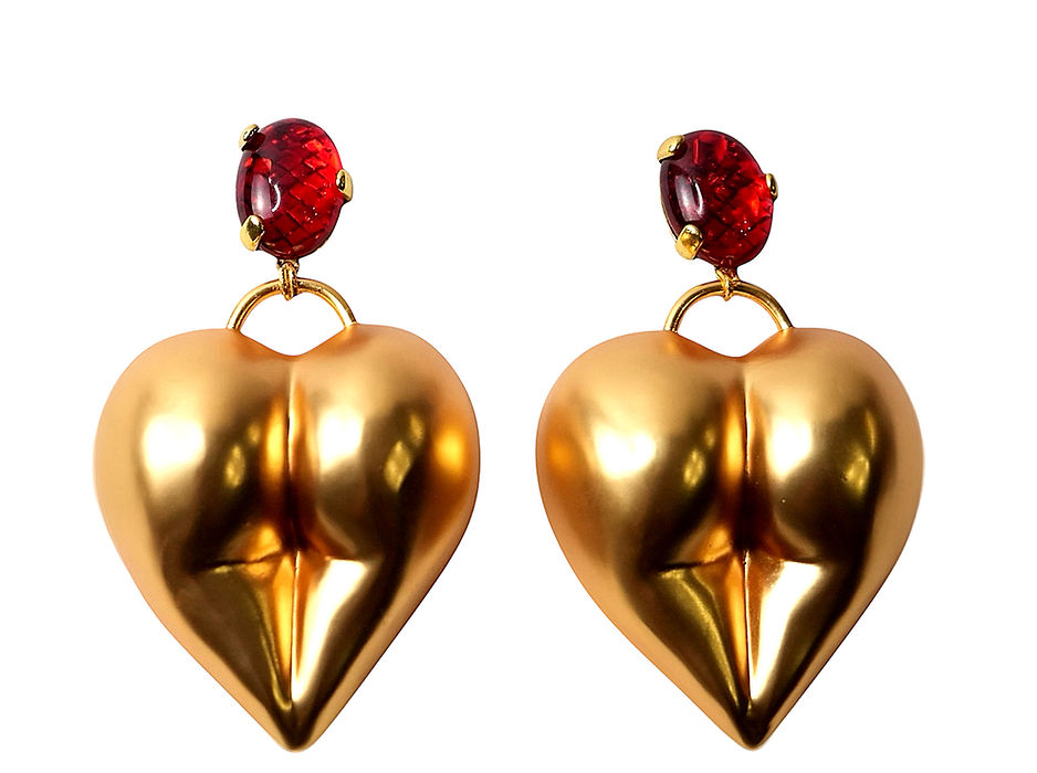 These earrings are made of hammered gold-plated brass and feature simulated rubies.