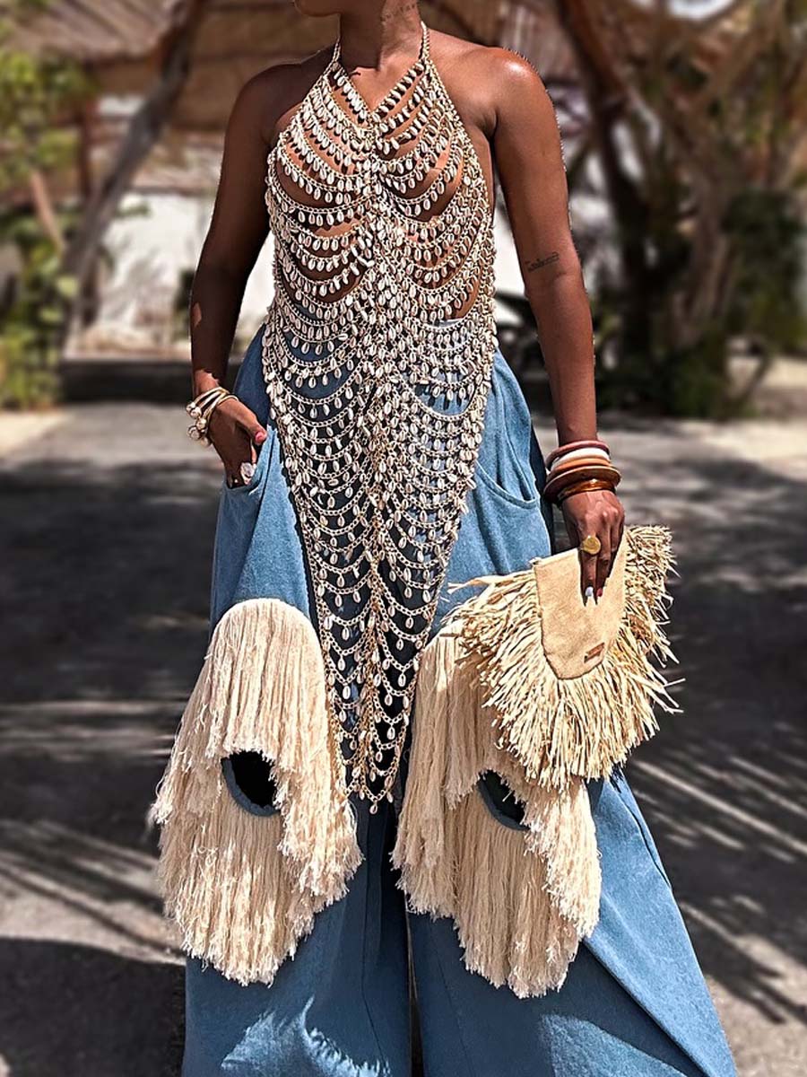 Halter Neck Sexy Hollowed Out Vest & Tassel Pants