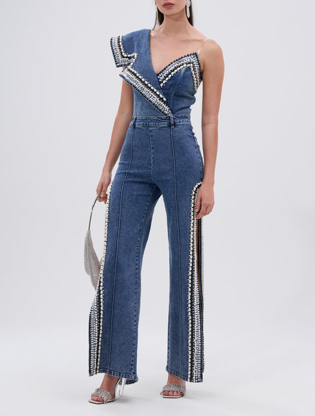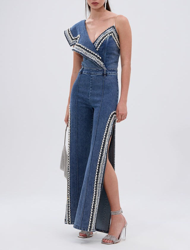 Luxury Denim Asymmetric Pearl Bodysuit + Side Slit Jeans