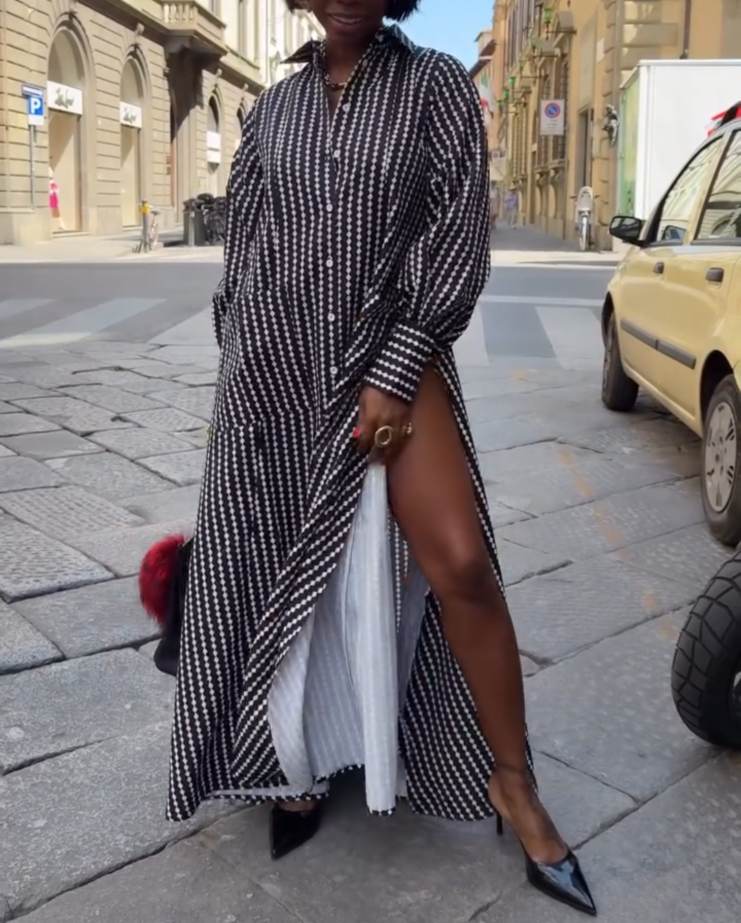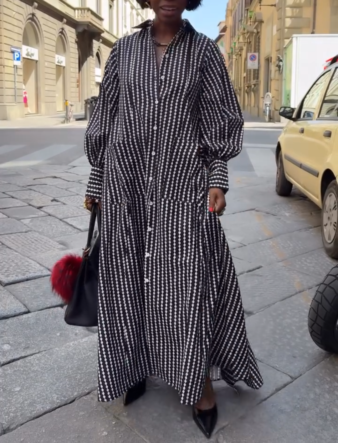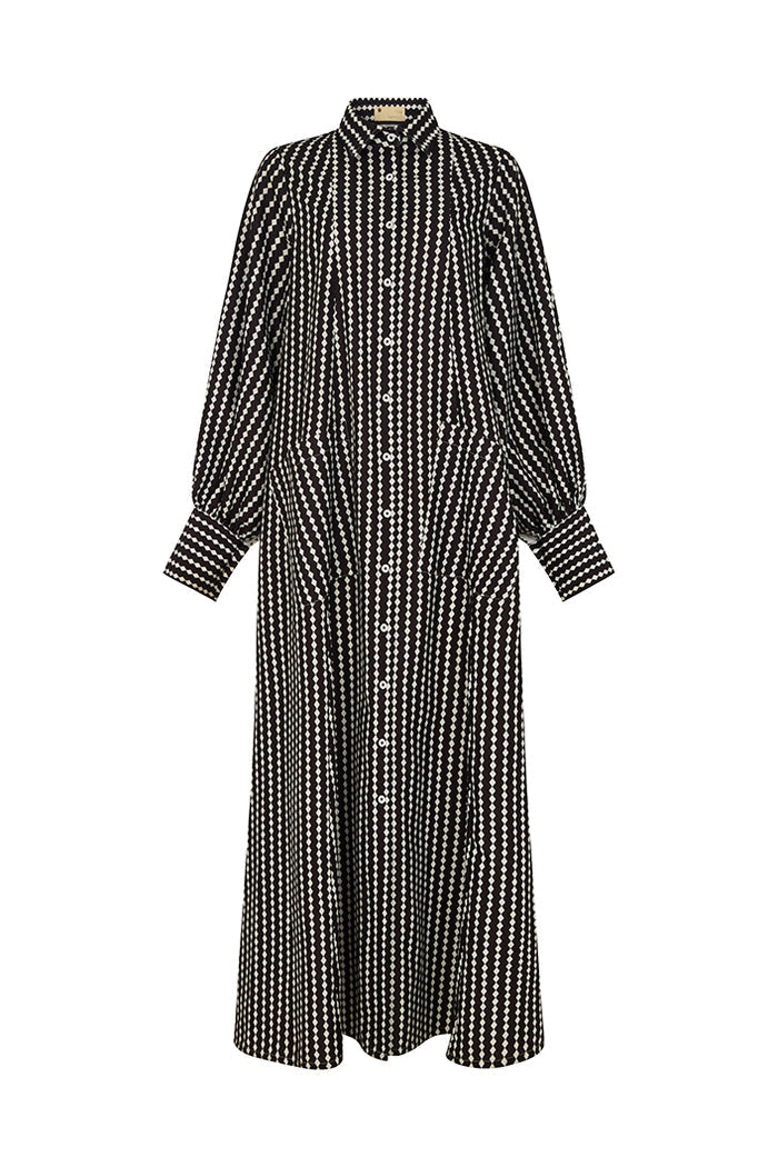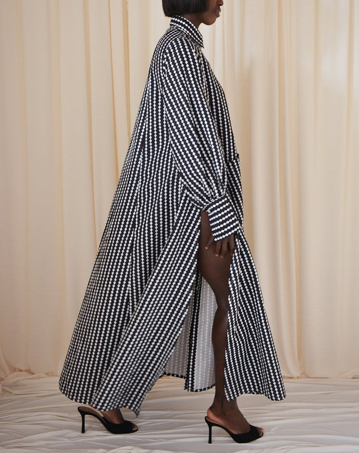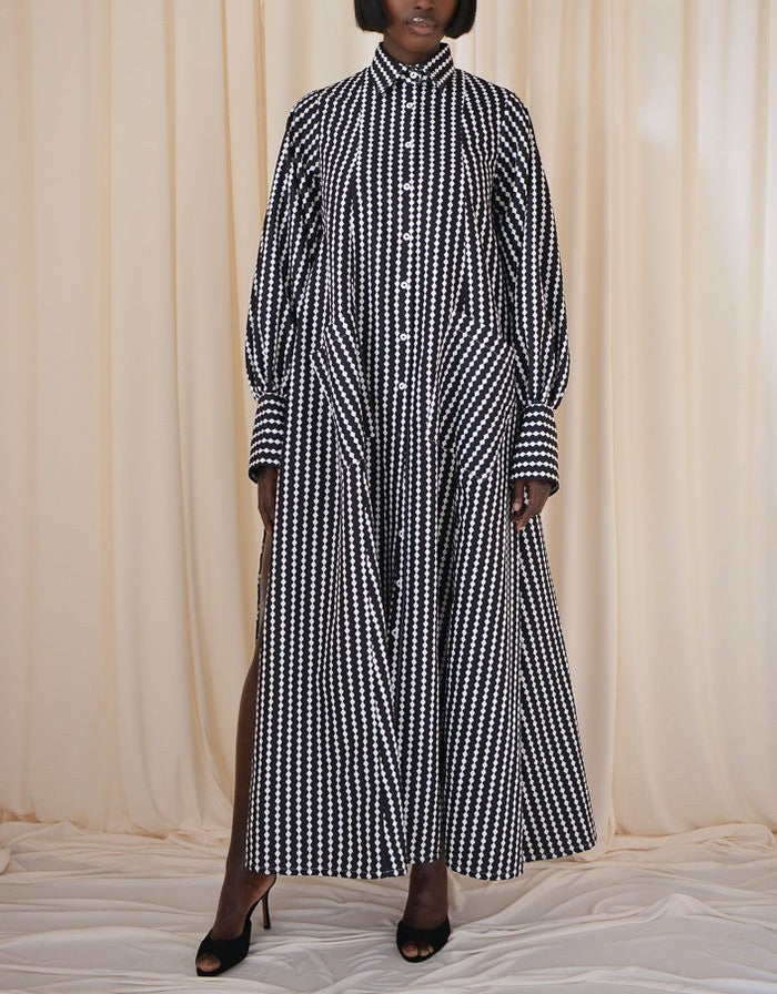 Maxi Flared Shirt Dress In Black&White Diamond Stripes