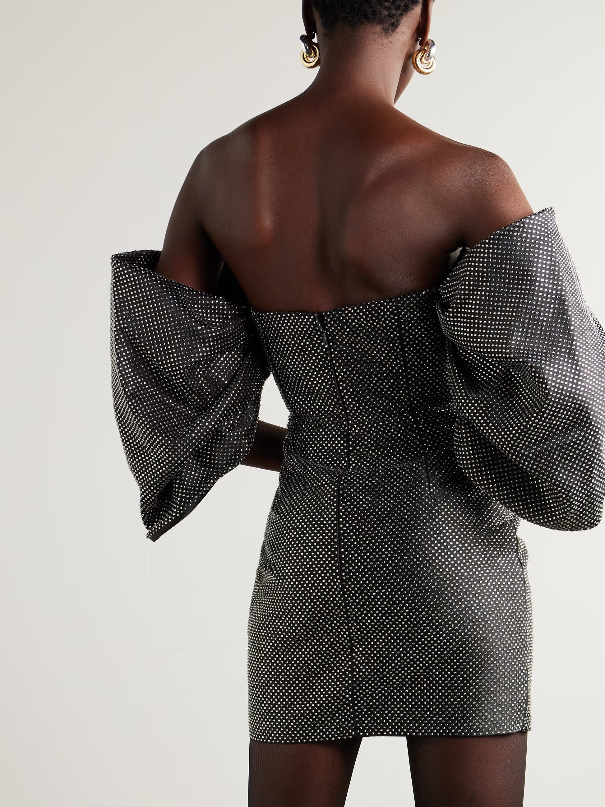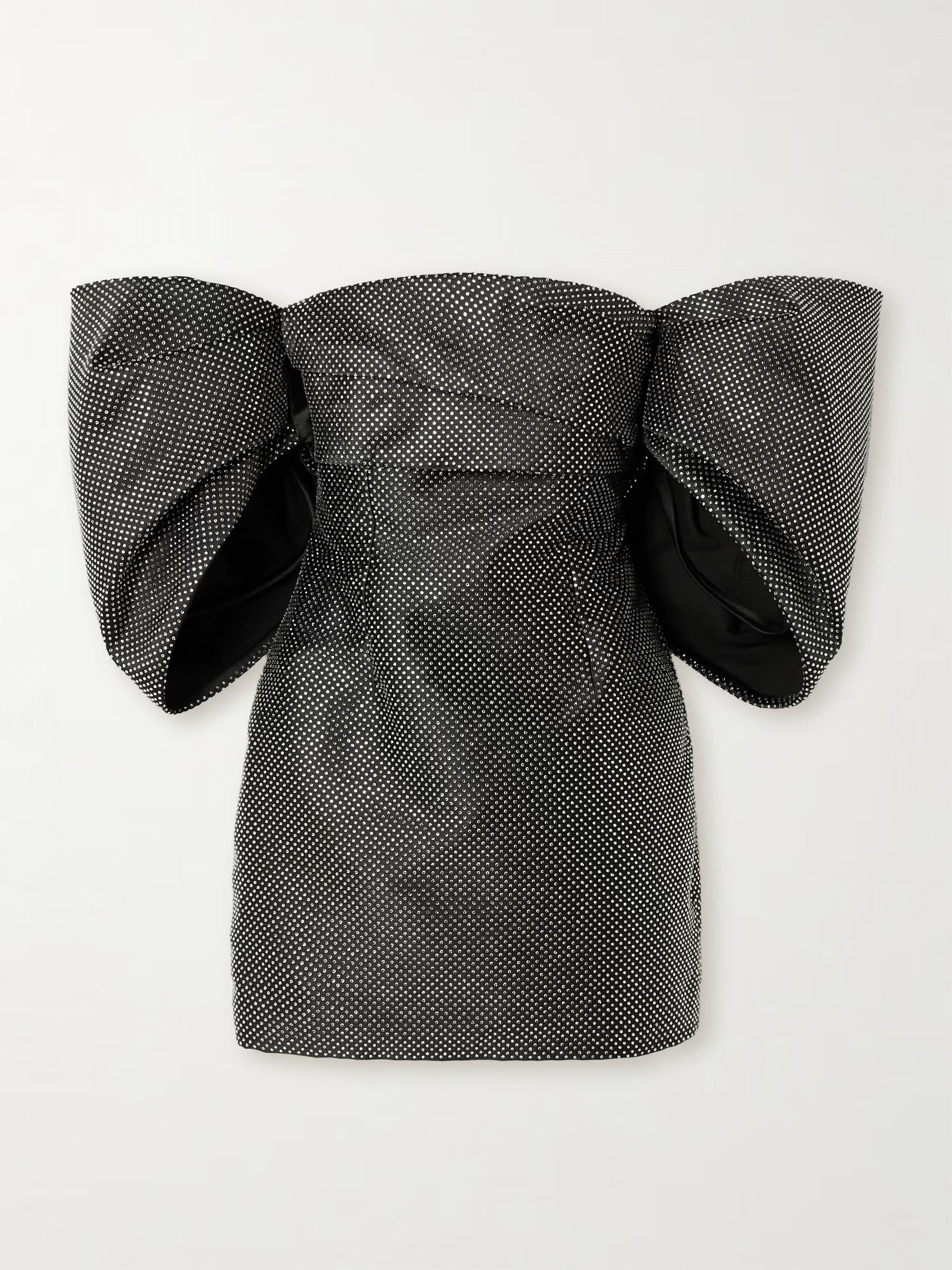 Off-the-shoulder ruched crystal grosgrain mini dress