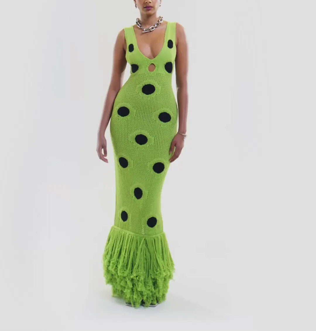 This fitted knit dress features a plunging V-neckline and small cutouts at the hem. It's detailed with fringe and polka dots at the hem.