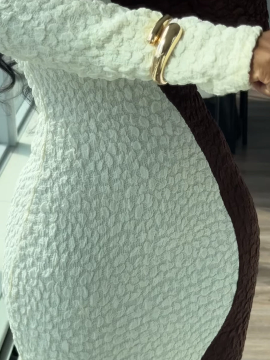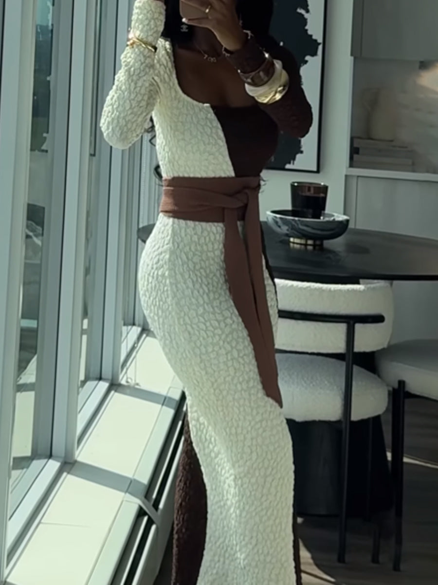 This dress is at the top of our new season hit list babe. Featuring a fluffed ribbed knit material with long sleeves and a maxi length, we're obsessed. Add heeled mules and simple accessories for a seriously chic look.