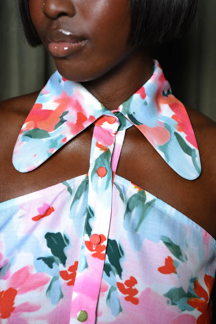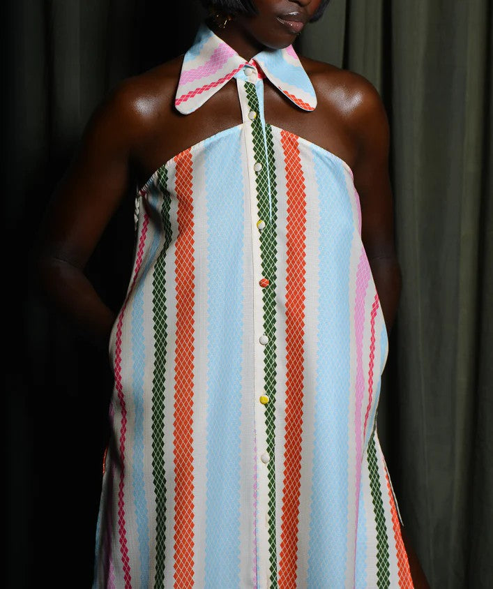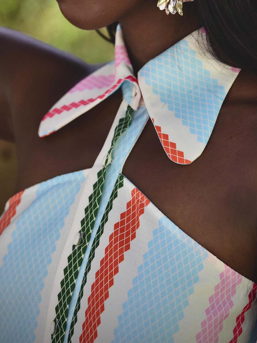 Classic shirting gets a bold upgrade in this Sleeveless Cut-Out Maxi Shirt Dress, featuring vibrant multi-colour diamond stripes over a cream and blue striped base. The sleeveless silhouette and sharp collar bring structure, while a striking front cut-out adds a modern, skin-baring twist.