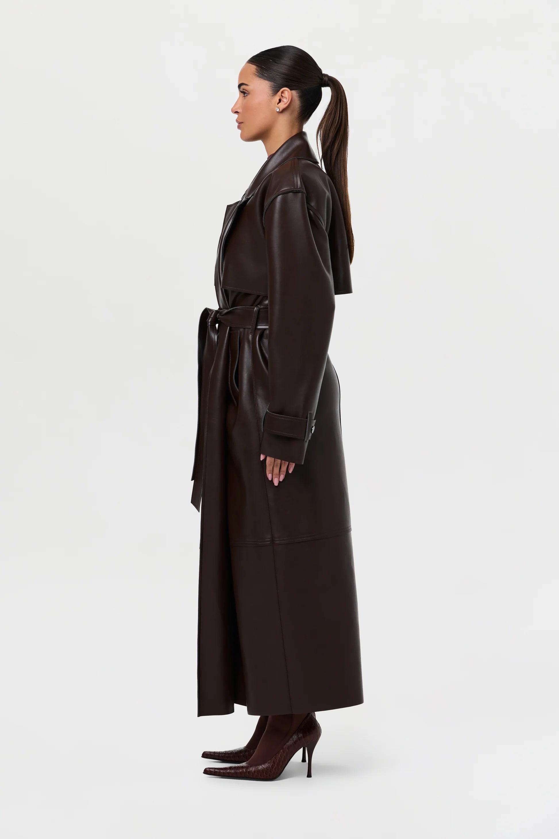 Our vegan leather oversized trench coat are what Fall and Winter dreams are made of! Designed with a luxurious smooth and buttery feel, notched collar and lapel, power shoulders, belted tie closure at the waist and back storm flap detail. Raw edge trim and adjustable hardware at the cuffs with loops complete the look. This is the perfect wardrobe staple to wear on rotation.