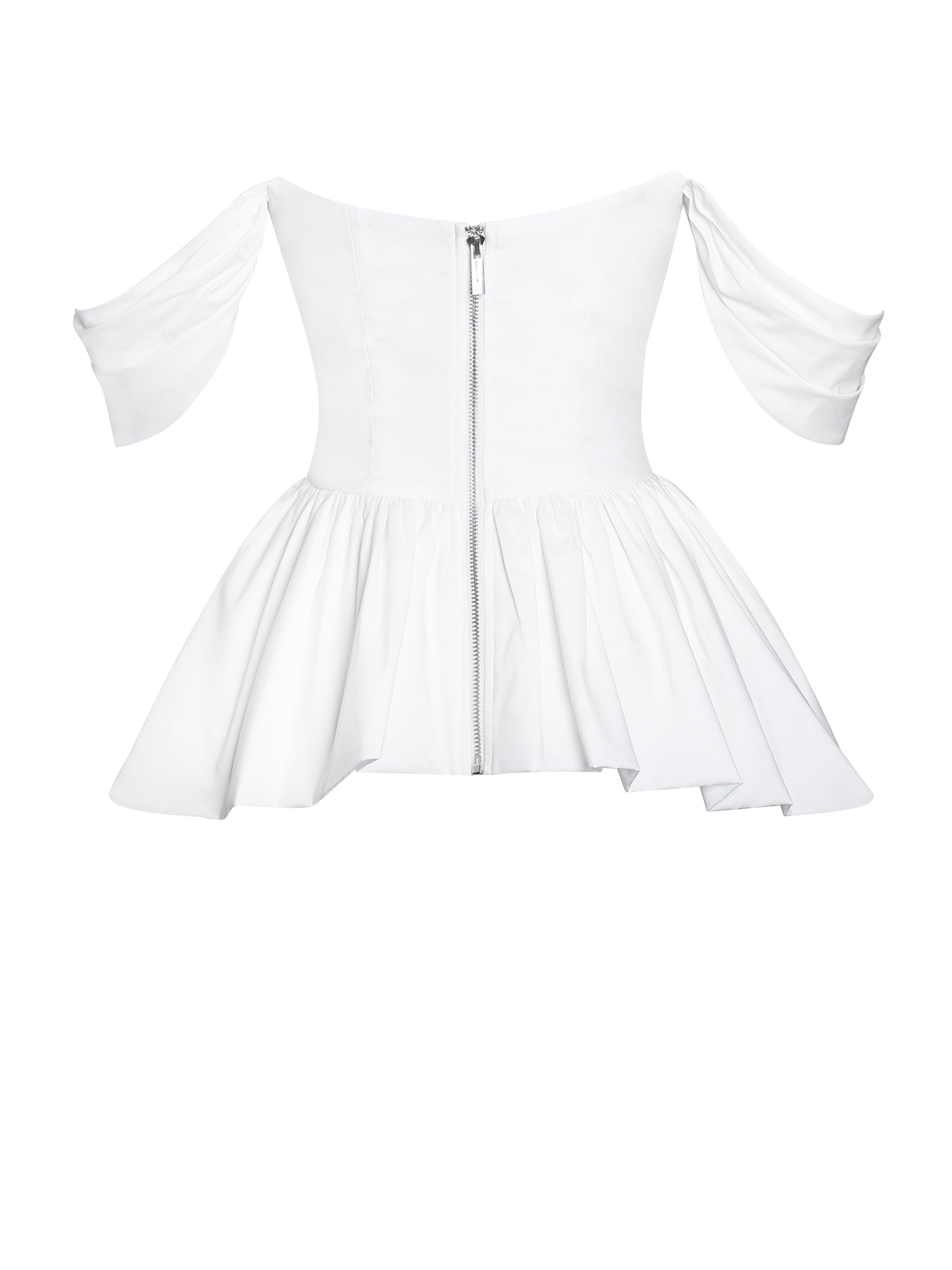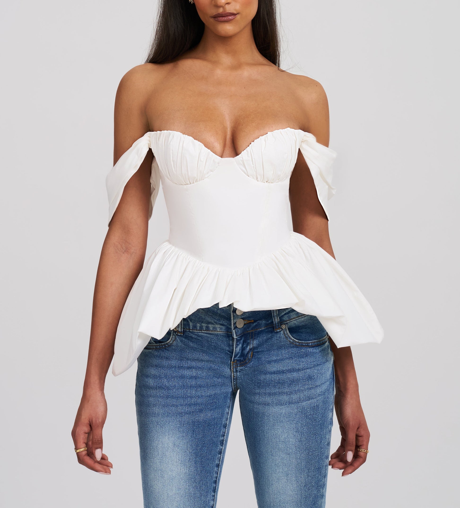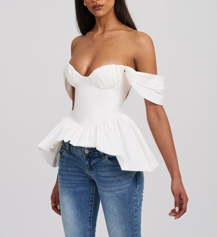 This Top is a chic business casual piece, perfect for the office and spring outings. Crafted from crisp white cotton poplin, it features an off-shoulder neckline that adds a touch of elegance. The ruched breast design with padded cups provides structure and a flattering fit, while the peplum silhouette and bubble hem create a graceful, feminine shape. Versatile and stylish, this top is an effortlessly sophisticated addition to any wardrobe.