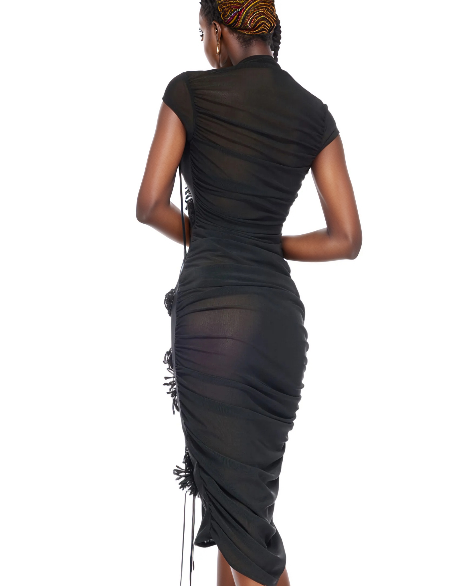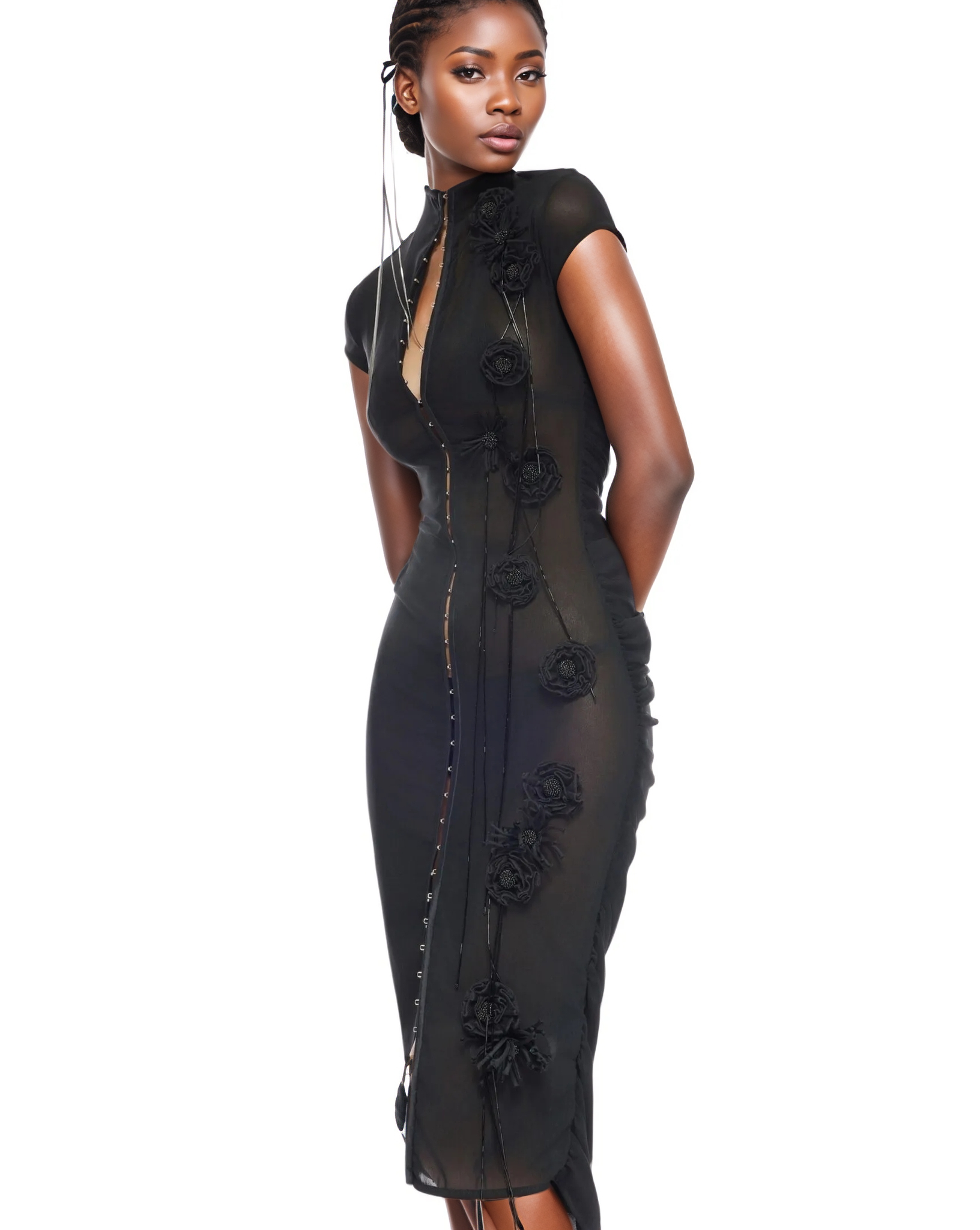 Semi-sheer stretch nylon mesh and hand embroidered flower midi dress