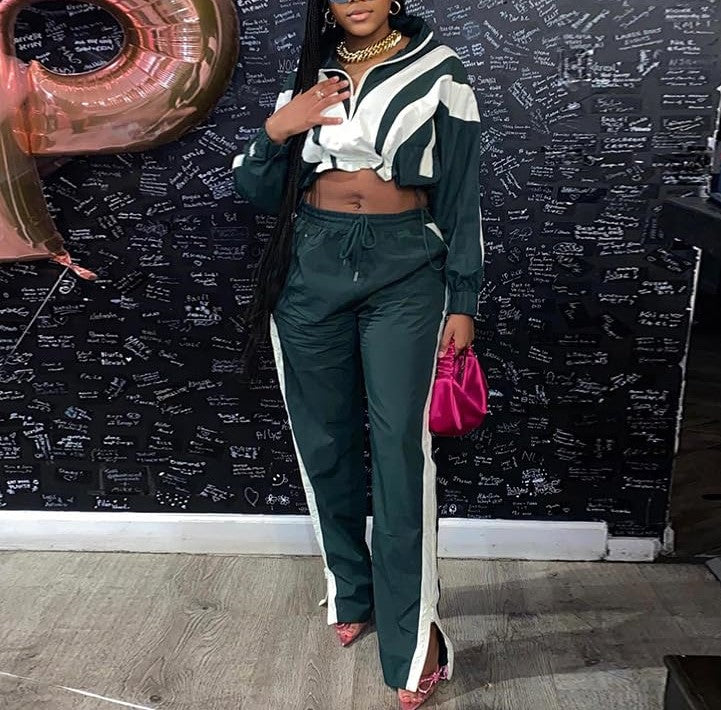 Style: The 80s outfit for women is long sleeve, color black, zip up front, crop top, drawstring at bottom of top and the waist of pants, elastic brand, striped, split wide leg sweatpants. The matching set creates casual, retro and fashion style