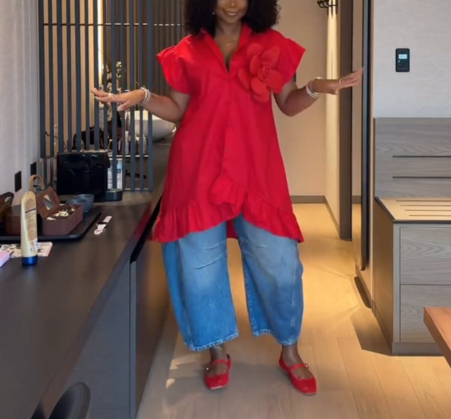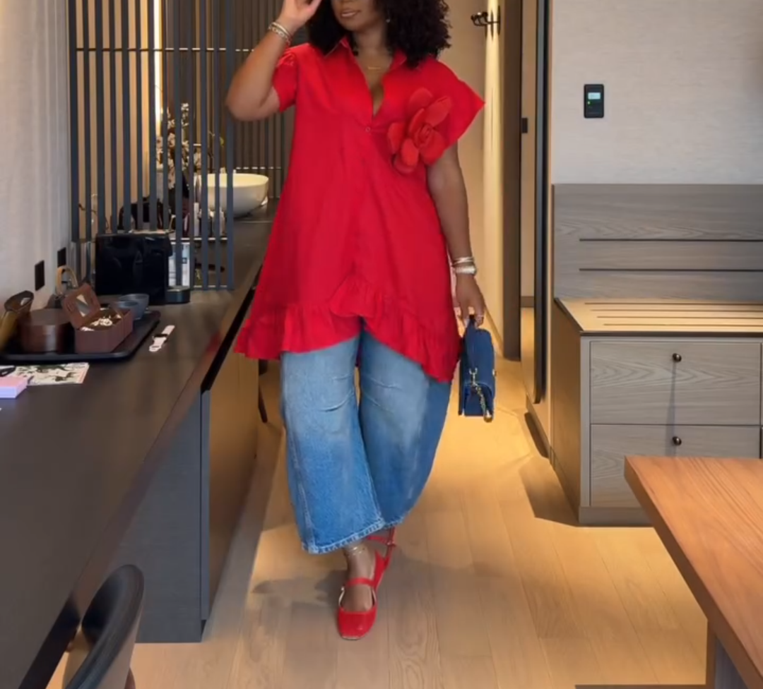 Features: Solid color, button down, v-neck, short sleeve shirt. Solid flower on chest make it fashionable. Ruffle irregular hem flow as move.